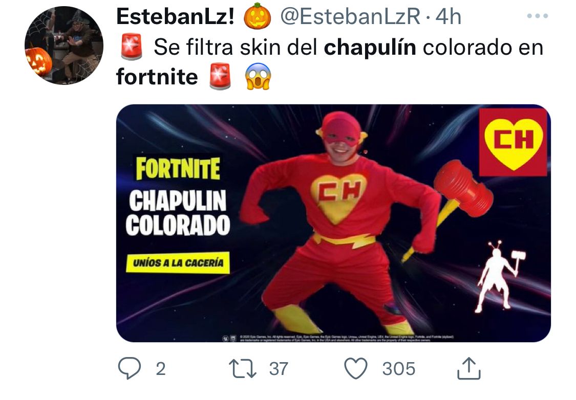 A alrededor de las 1430h CEST del viernes 29 de octubre de 2021 varios creadores de contenido hispanohablantes de Fortnite lanzaron teasers en sus redes sociales que apuntan a que El Chapulín Colorado el personaje de la comedia mexicana homónima llegará como un skin al videojuego de Epic Games. 1 day agoMexican character El Chapulin Colorado will soon enter Fortnite with a surprising collaboration. Epic have confirmed in a blog post that the Chapulin Colorado cosmetics will either be.